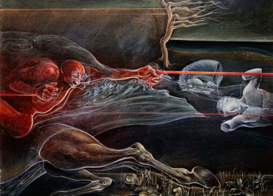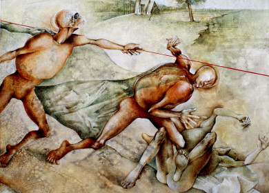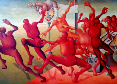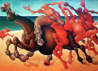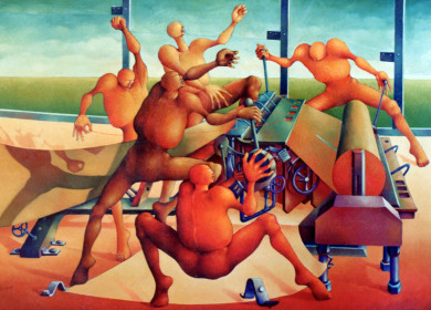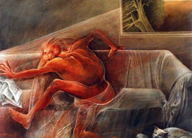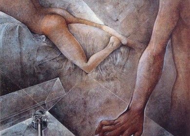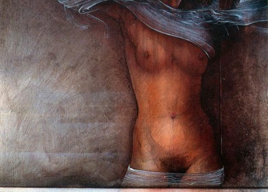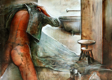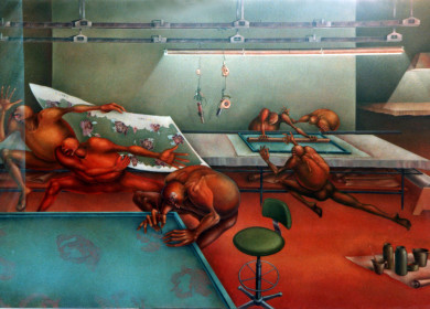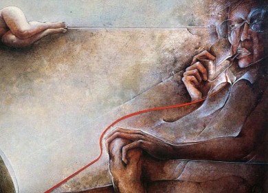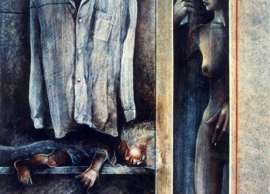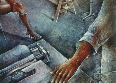 …scorci di interni. azioni quotidiane, momenti di relax o di lavoro…una riflessione che va oltre l’immediatezza dell’immagine per riconquistare le sensazioni più intime, i più nascosti sentimenti, le più semplici motivazioni di vita…Il segno grafico riprende una posizione di primo piano, divenendo strumento eloquente al pari del colore e assumendo a volte una valenza interpretativa indispensabile per la significatività del quadro.